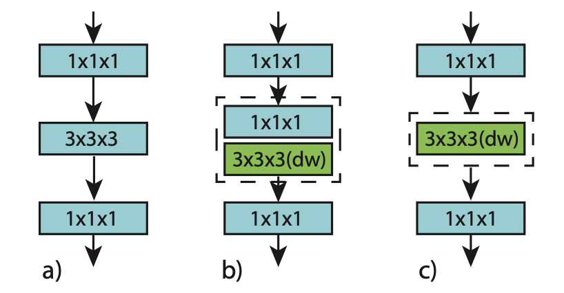 - a는 ResNet bottleneck을 나타내고 두개의 1x1x1 과 3x3x3 conv layer로 이루어져있다.