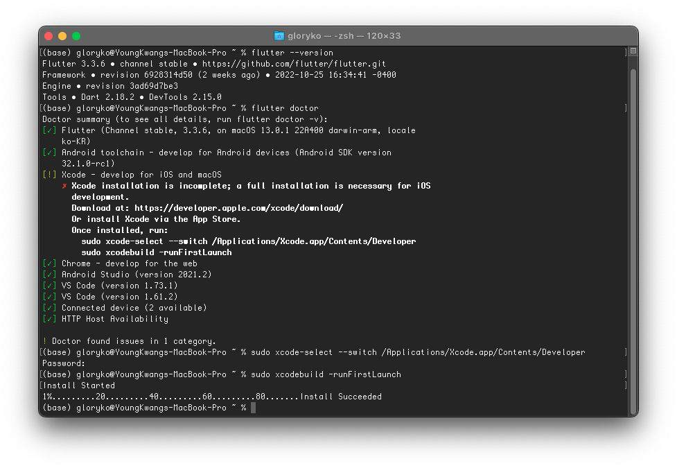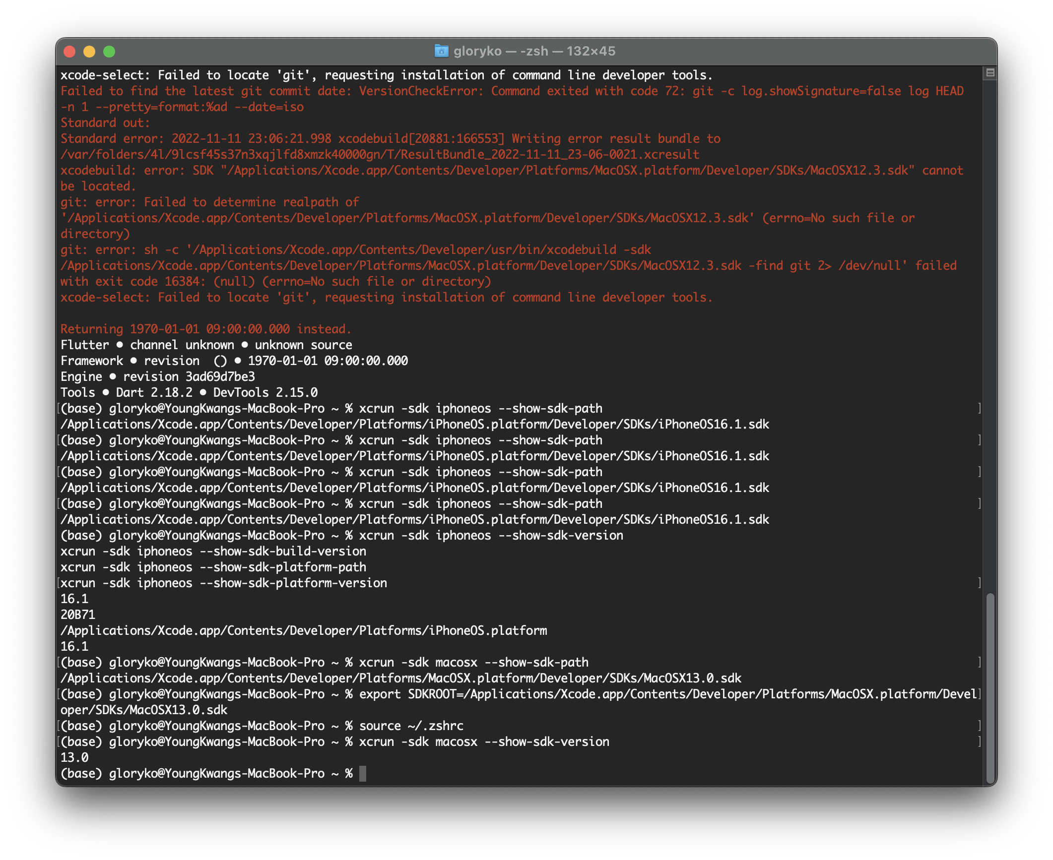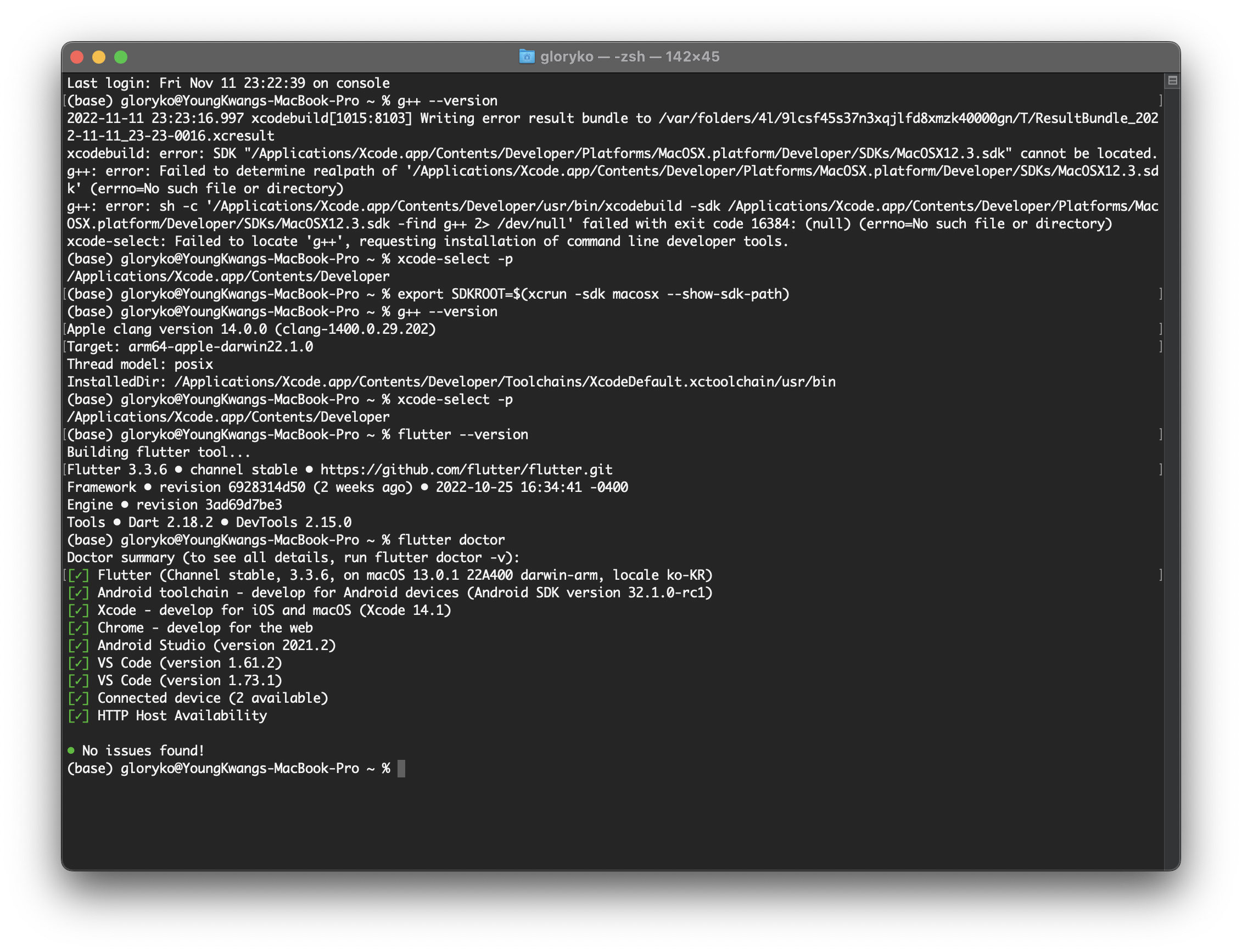 22.11.11 16 Ventura 13업데이트 이후 g++/ git / flutter 모두 같은 방법으로 해결