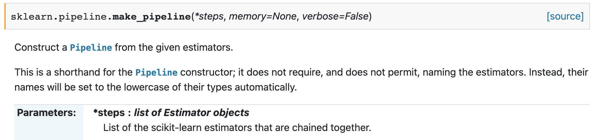 파이프라인은 아래와 같이 estimator object 타입 리스트를 받는다고 되어있어 eval로 덮어주면 끝인줄 알았으나, 원했던 것처럼 OutlierTrimmer를 거치고 PowerTransformer를 거치는 것이 아니라 오른쪽과 같이 리스트에 담겨서 한꺼번에 처리되게 되었다.