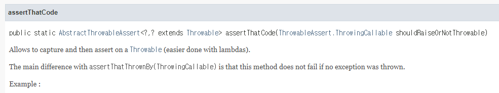 하는 일은 assertThatThrownBy와 동일하게 throwable을 잡는다고 적혀있었다. 차이점은 exception이 발생하지 않은 경우 에러를 발생시키지 않는 차이라고 명시되어 있었다.