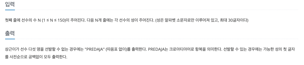 이 문제의 경우 각기 같은 알파벳으로 시작하는 이름이 5개라면 정답 배열에 추가하고 모든 가능 값을 출력하는 문제입니다.