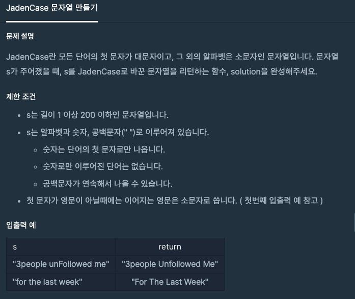 JadenCase란 모든 단어의 첫 문자가 대문자이고, 그 외의 알파벳은 소문자인 문자열입니다. 문자열 s가 주어졌을 때, s를 JadenCase로 바꾼 문자열을 리턴하는 함수, solution을 완성해주세요. 제한 조건