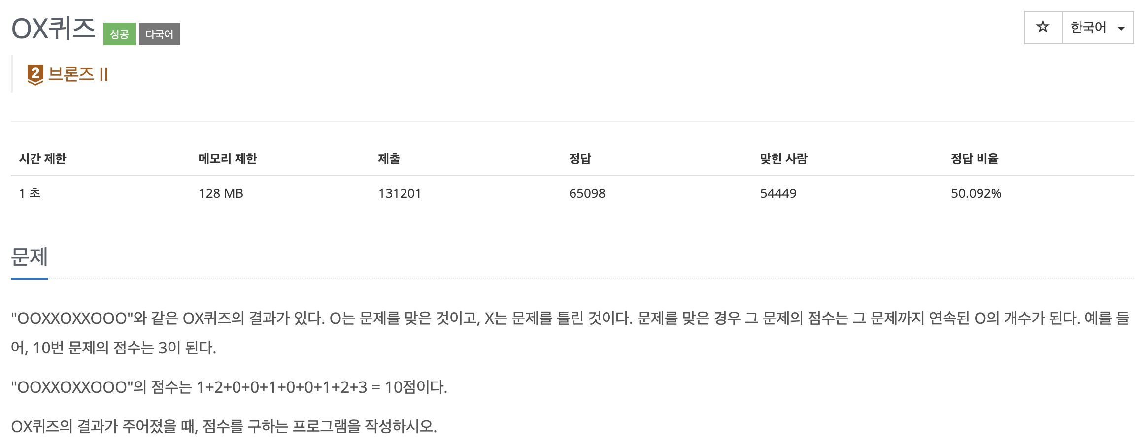 "OOXXOXXOOO"와 같은 OX퀴즈의 결과가 있다. O는 문제를 맞은 것이고, X는 문제를 틀린 것이다. 문제를 맞은 경우 그 문제의 점수는 그 문제까지 연속된 O의 개수가 된다. 예를 들어, 10번 문제의 점수